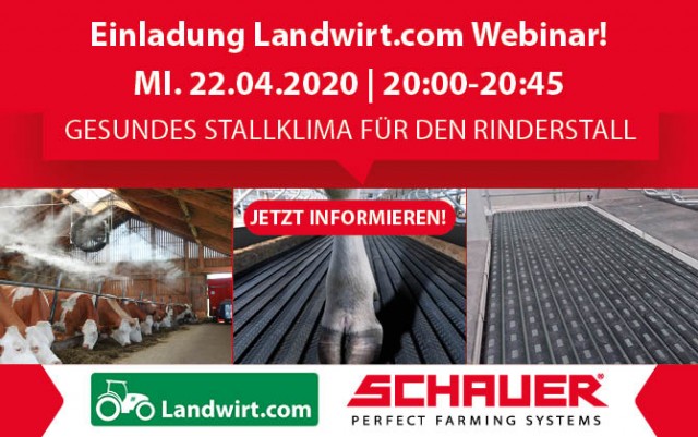 Das „Klima“ für Rinderhalter ist aktuell nicht einfach. Sie haben mit der Herausforderung eines schwankenden Marktes zu kämpfen. Gleichzeitig sollen Sie klimafreundliche Investitionen tätigen. Mit den Innovationen Meadowfloor Laufgangrillenplatten und Magellan Rillengummimatten von Schauer können Sie nicht nur klimaschädliche Emissionen verringern, sondern auch durch gesündere Klauen das Tierwohl und die Leistungen steigern. Ebenso werden es Ihnen die Rinder danken, wenn Sie mit moderner Lüftung und Kühlung den Hitzestress im Sommer verhindern. Mehr dazu erfahren Sie beim Webinar.